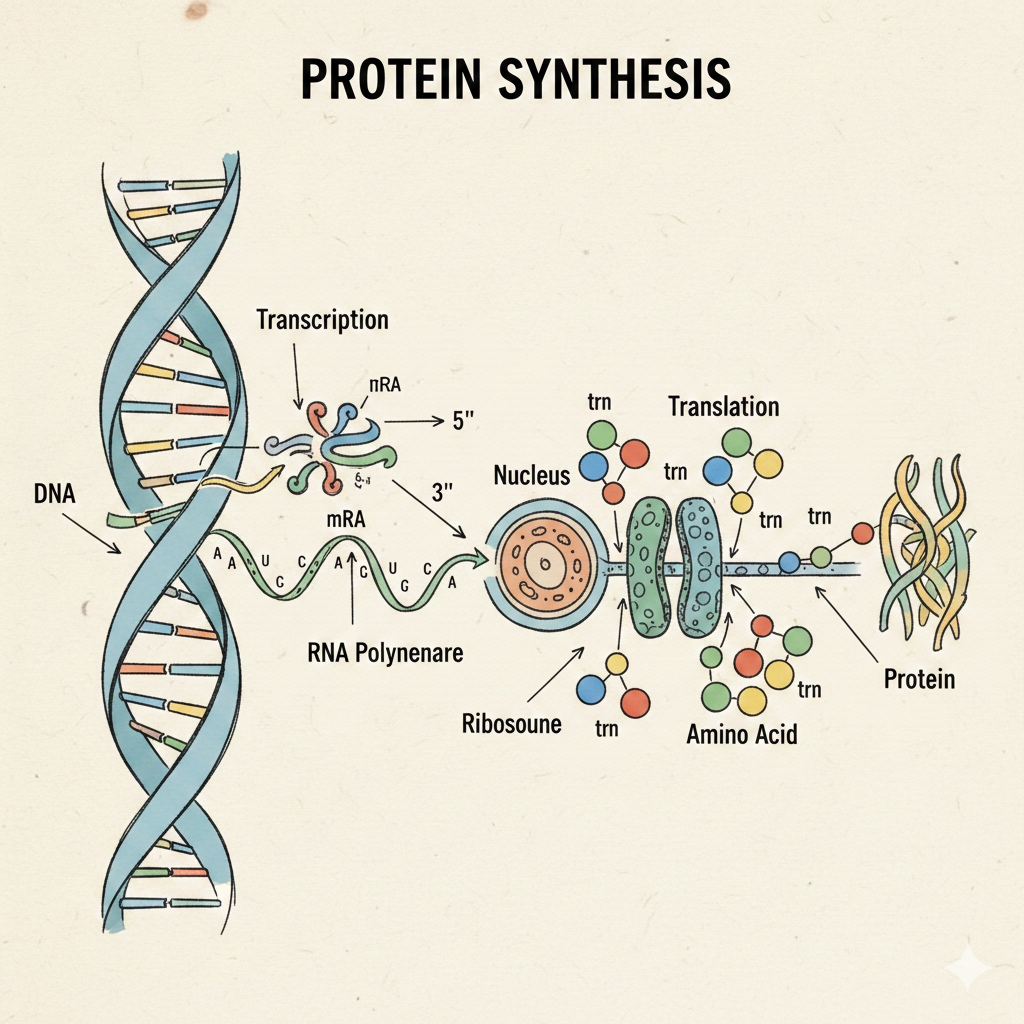 Når man taler om "kaos" i den genetiske kode under proteinsyntesen, bevæger vi os helt ned i cellens kommandocentral. Hvis koden er defekt, eller hvis aflæsningen svigter, svarer det til at give en bager en opskrift, hvor hver tiende side er revet ud eller skrevet på et sprog, han ikke forstår.